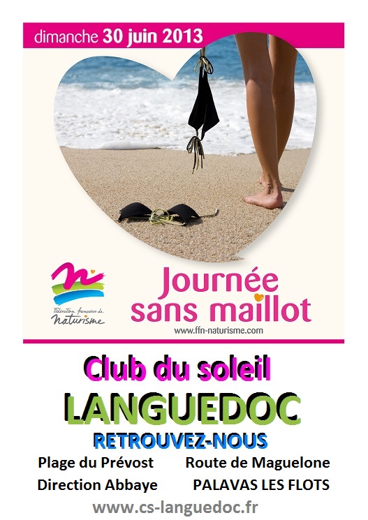 Organisation de la 3ème Journée Sans Maillot : Dimanche 30 juin 2013 L’organisation de la Journée Sans Maillot devient un évènement très attendu par les naturistes désireux de faire partager un art de vivre. La Fédération Française de Naturisme a choisi le dimanche 30 juin 2013 pour cette 3ème journée sans maillot. Cette
